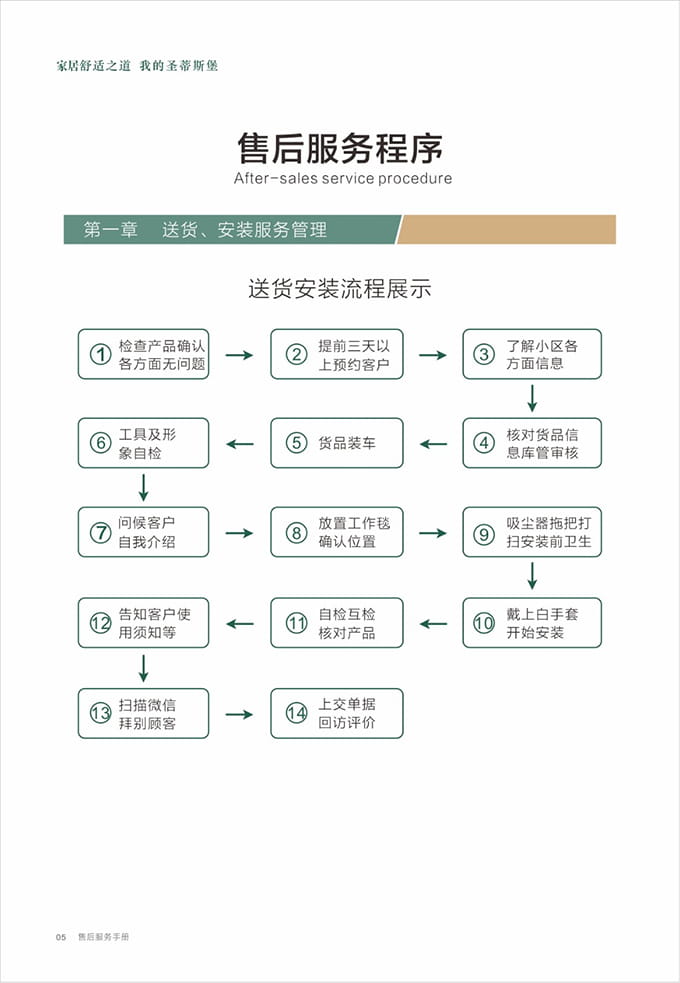 物资准备:上门前必须着J9集团统一工作服,佩戴工作证,准备好安装工具、搬抬工具(搬运背带等)、备件、笔记本、手套、鞋套、地垫、卫生清扫工具(清洁剂、抹布、扫把簸箕、拖把、吸尘器等)、瓶装水、《J9集团安装施工指示牌》、收据和J9集团产品说明书、《产品配送单》和《配送满意度调查表》等物品。再带上小礼品,例:鲜花或碳包去味礼包等。