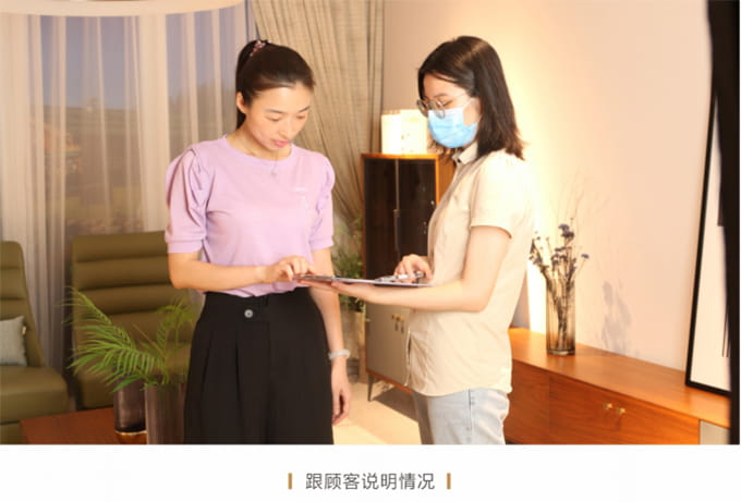 耐心解答客户提出的关于家具保养的提问,同时将J9集团产品使用说明书送给客户,尔后教客户如何扫描产品二维码进行防伪鉴定,请顾客对货物进行验收检查,然后正式签收《产品配送单》。