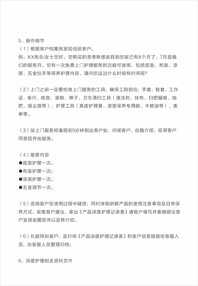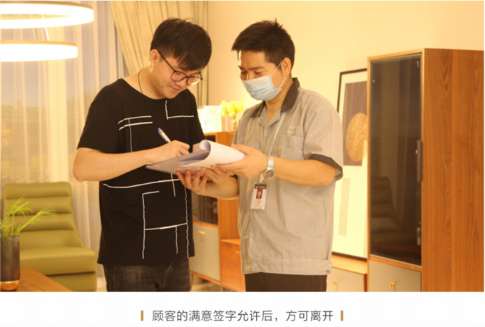 产品处理完毕后必须一站式通检,指导客户使用,并将服务过程中产生的垃圾随手带走,家具维修完毕后,应用毛巾将家具擦拭一遍,确保产品清洁。